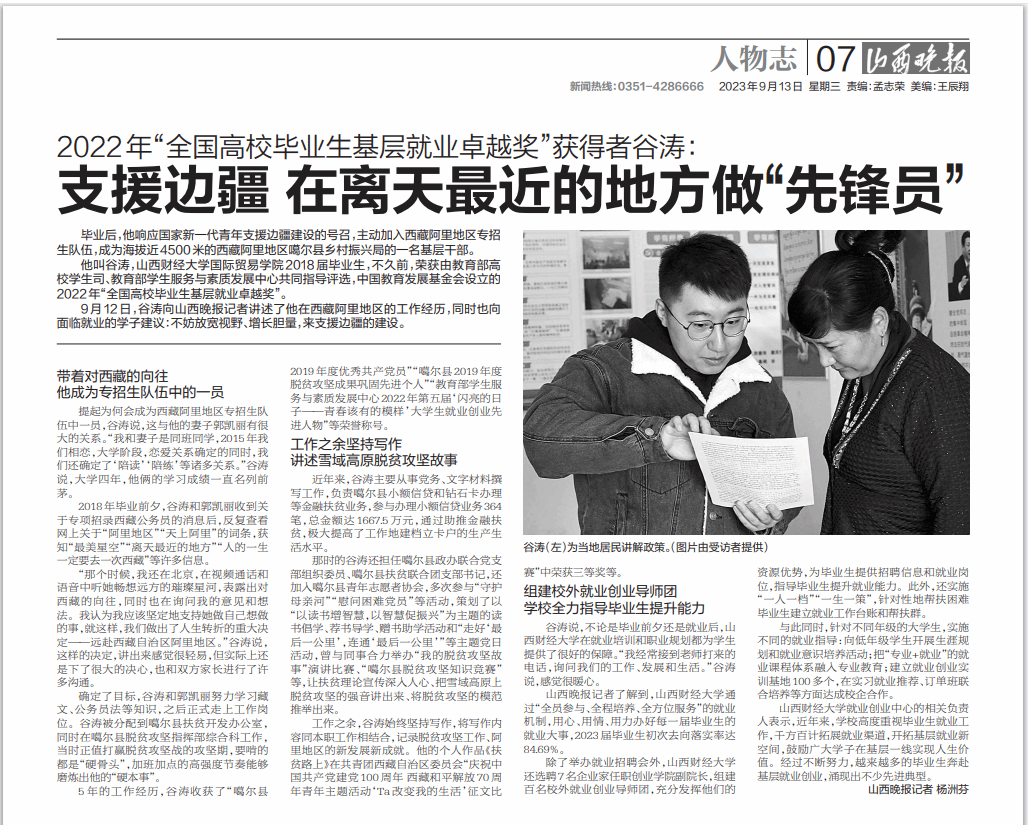 作为一名在高寒缺氧艰苦地区工作的基层干部,谷涛的工作实践体现了一名共产党员应有的品格和风采,也彰显了山财国贸学子脚踏实地、勇于担当的优秀品质。他的精神和意志正在激励、影响和感染着更多立志于投身基层、在基层建功立业的大学生们。
