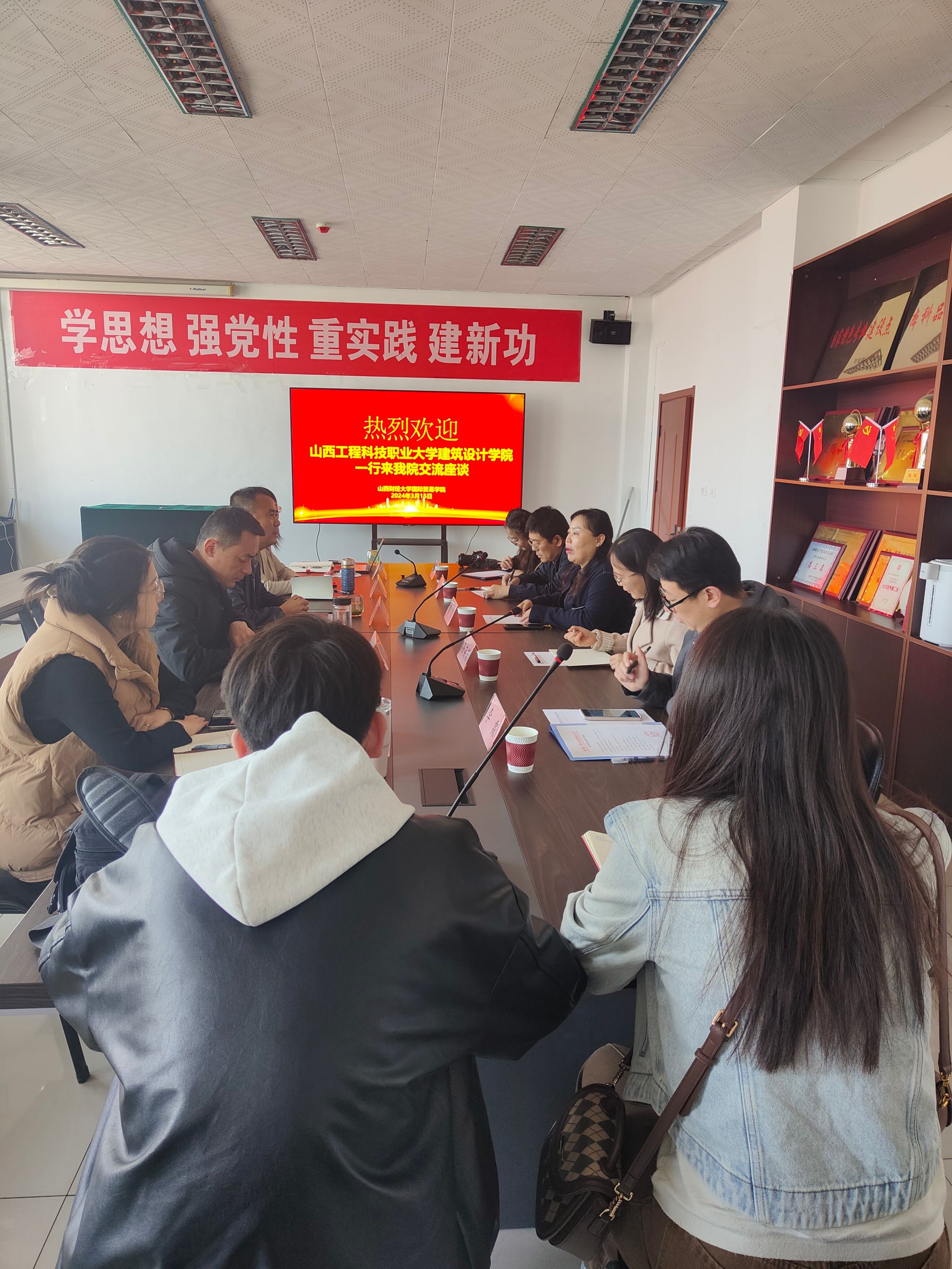 为深化院际间交流合作,2024年3月15日上午,山西工程科技职业大学建筑设计学院副书记马丽、副院长孙英芳、学工办公室主任赵飞、团委书记李霖、综合办公室干事余晓雯及学生会干部一行7人来学院开展交流座谈。座谈会由学院党委书记陈晓虎主持。副书记殷丽娟、副院长刘军及科级干部参加了座谈交流。