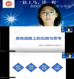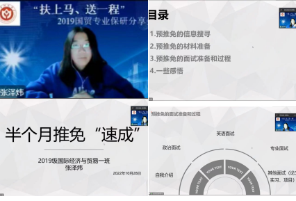 1029日晚1900-2100,国际贸易与经济教研室利用腾讯会议举行了国际经济与贸易专业线上保研分享会,分享会邀请了2019级国际经济与贸易专业推免至同济大学教育学专业的韩妮同学、推免至中南财经政法大学国际商务专业的娄薪宇同学和推免至南京师范大学国际商务专业的张泽炜同学进行了分享,2020级、2021级和2022级国际经济与贸易专业100名学生参加了分享会。
